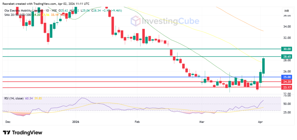 Ola Electric is attempting a V-shaped recovery from extreme oversold conditions. The RSI at 60 indicates control by buyers without the risk of overbought conditions. The stock faces immediate friction at ₹28.65, followed by the psychological round figure ₹30.00. To confirm a structural trend reversal, the price would have to break out above ₹35. The pivot is at ₹25.00 while the primary support is at ₹22.25. At ₹23.17, a second support zone is set up.