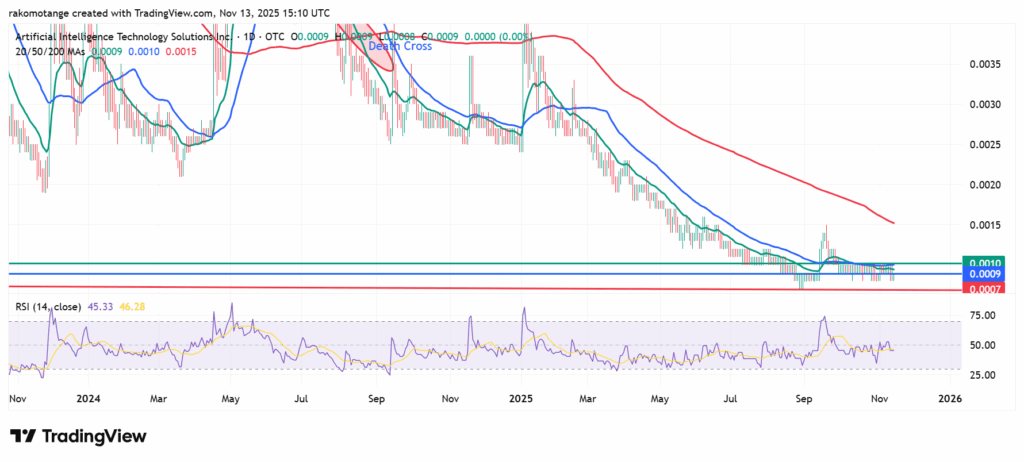 AITX stock price has been stuck in a relentless downtrend this year, showing little sign of recovery. As of mid-November 2025, the stock is hovering near $0.0008, barely off its multi-year lows and down by 64% since January. Even short bursts of buying have fizzled quickly, and volumes remain thin.