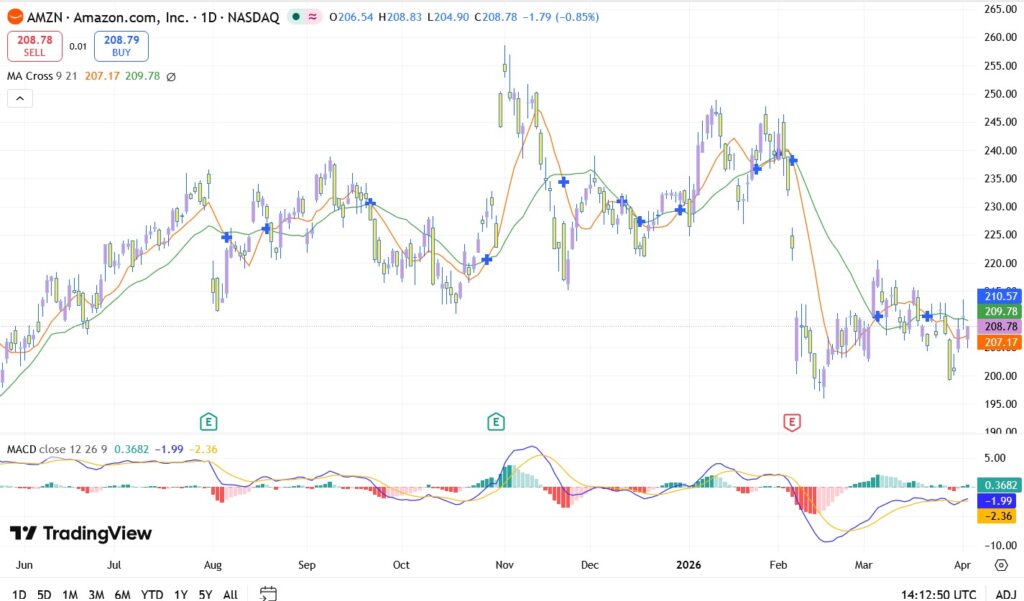 - Amazon (AMZN) is currently trading at $208.78, down 0.85% as it tests key short-term moving average support levels.