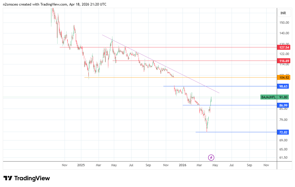 The Bajaj Housing Finance share price remains in a downtrend amid fragile sentiment. Recent commentary on this stock noted that it was trading dangerously close to its 52-week lows as of late March. However, the live chart indicates that April has kicked off a recovery from the lows of ₹72.65 at the end of March. It now trades in the ₹89–₹92 range, indicative of broader stabilization in Indian stock markets amid the de-escalatory tone of recent geopolitical headlines.