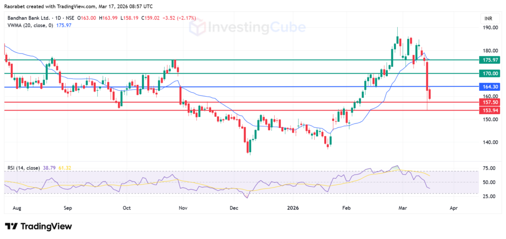 The momentum on Bandhan Bank stock signals control by the sellers. The stock is currently under selling pressure, with immediate support around ₹153.94. Should this level fail, the next critical support is near ₹134.30, which represents a significant low point.