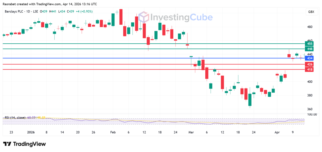 Barclays share price daily chart with key support and resistance levels for April 15, 2026. Created on TradingView