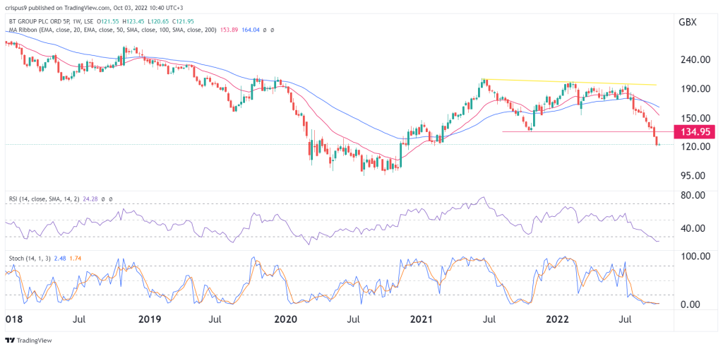 BT share price had a terrible performance in September as it crashed by more than 15%. The stock dropped to a low of 121.45p, which was the lowest level since February 2021. It has crashed by about 40% from its highest level this year, giving it a market cap of more than 12 billion pounds. This makes it one of the worst performers in the FTSE 100.