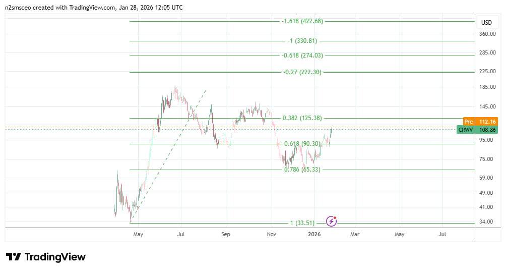 The CoreWeave share price bounced off the 78.6% Fibonacci retracement of the 21 April – 6 August 2025 price swing. This bounce is a double top, having occurred twice on 26 November and 17 December 2025.