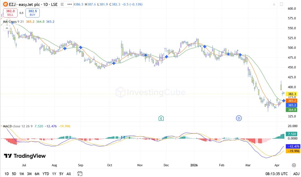 The budget airline closed Wednesday at £3.93, advancing 9.99% in a single session on volume of 9.6 million shares, well above the 50-day average of 6.5 million. The stock traded as high as 382.5p on Friday morning, extending gains as investors continued to pile into beaten-down travel names following the geopolitical truce.