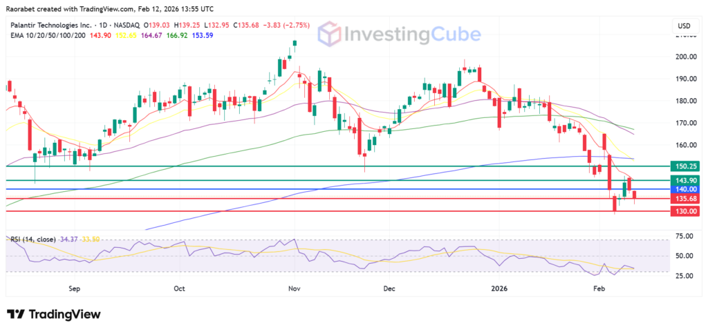 Palantir stock RSI reading at 34 supports the bears. The stock will likely struggle for upside momentum if resistance persists at the psychological $140. With the sellers in charge, initial support is likely to be at $135.68. A break below that could send it lower to test $130. On the upside, the first resistance is at the 10-day EMA at $143.90, with the second barrier at $150.25.