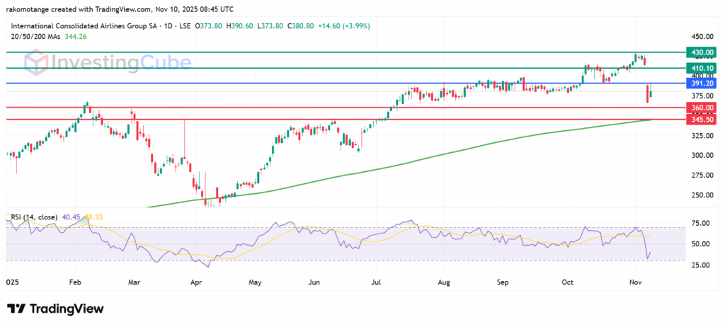 The most immediate and critical technical support level for IAG’s stock is around 360 pence (p). This level is highly significant as it aligns with previous consolidation highs.