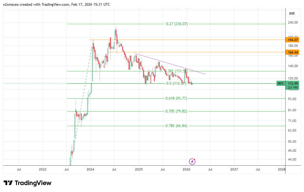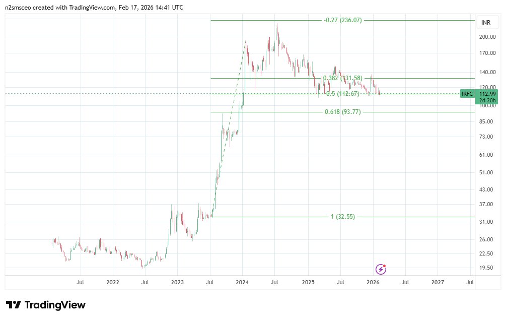 The IRFC share price is now in a correctional phase, with gradually lower tops pushing against the 112.67 support and 50% Fibonacci retracement level of the July 2023 – January 2024 upswing.