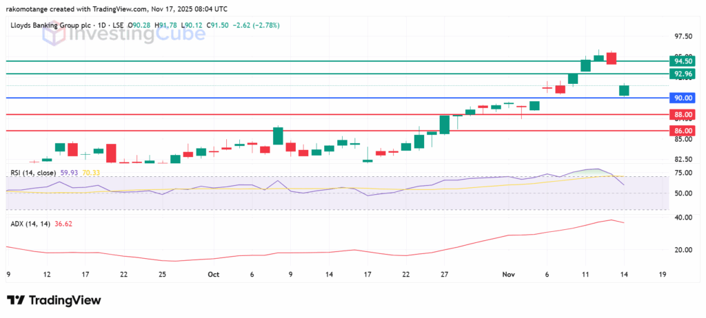 Lloyds Banking Group stock (LSE: LLOY) took a tumble on November 14, closing at 91.50 pence (p), down from 94.12 pence. That’s a 2.78% drop with high volume, over 148 million shares traded. The stock started at 90.28 pence, hit a low of 90.12 pence, then recovered a bit. This comes just shy of the 52-week high of 95.86 pence, leaving many wondering if the coveted march toward the £1 mark this year has ended.