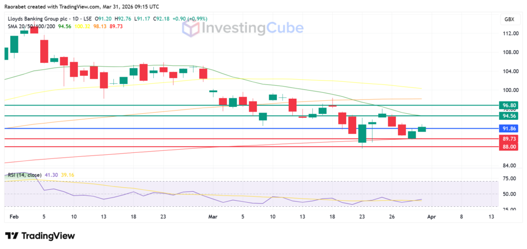 Lloyds Bank share price with the key levels of support and resistance on March 31, 2026. Created on TradingView