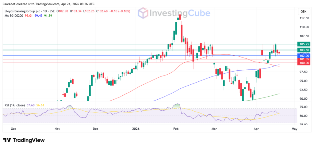 Following a notable downturn in February and March, during which its value approached the 200-day moving average, Lloyds Bank share price has experienced a strong rebound, rising by more than 10% this month. As of this writing, London Stock Exchange data indicates the shares are trading near 103p, prompting renewed discussions on whether the 100p mark could now serve as a lasting support level.