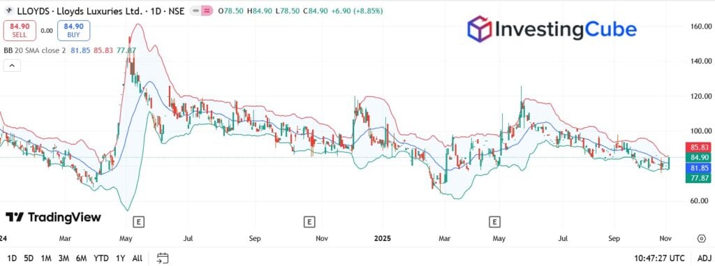 Lloyds shares show a notable recovery trend, closing at 84.90p, up nearly 9%. The price has rebounded sharply from the October lows near 77p, with the Bollinger Bands widening, a sign of growing volatility.