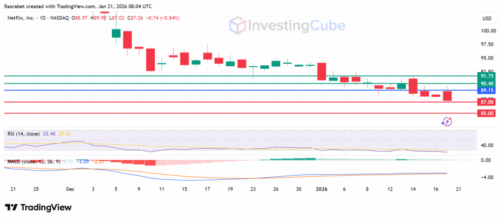 Netflix stock price is currently testing a critical support level at $87.00. The Relative Strength Index (RSI) is hovering near 25, signaling that the stock is technically oversold. Also, MACD bearish at -3.09. A sustained break below the first support could see the stock slide toward the $85.00 zone. Conversely, resistance is firmly established at $90.40, with a more significant ceiling at $91.75.