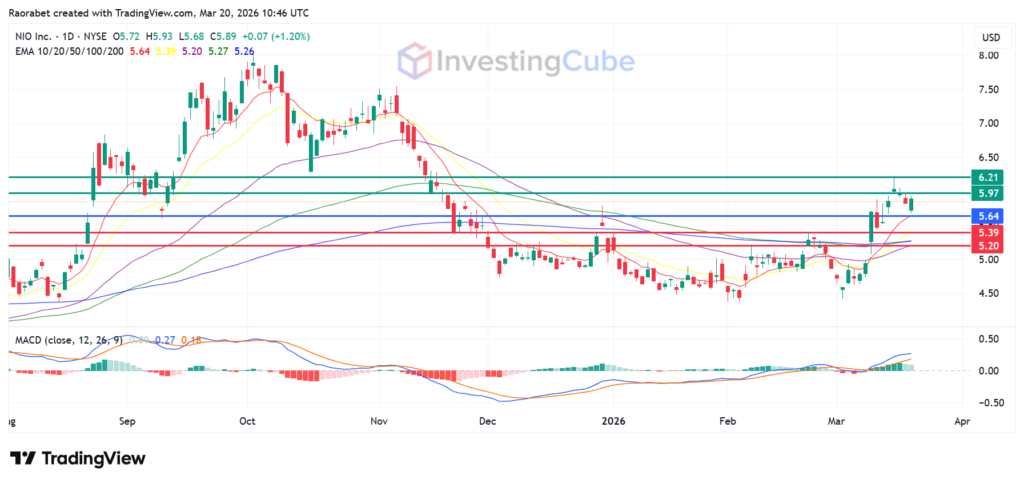 Right now, Nio stock price shows a buying hint on the daily MACD after the shorter average moved past the longer one. The pivot is at 10-day EMA at $5.64. On the upside, the stock faces a major resistance level at $5.97, with the next barrier at YTD highs of $6.21. Immediate support is firmly established at $5.39. Breaking below that level will invalidate the upside narrative. The next significant floor after that is at the 50-day EMA level at $5.20.