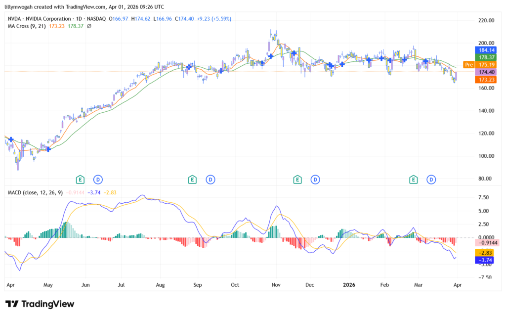 Nvidia is currently trading at $174.40, representing a daily gain of 5.59% as it rebounds from recent consolidation levels.
