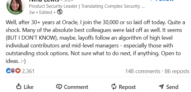 While the survivor’s post captures the exhaustion of those who remain, Nina Lewis’s story has ignited a different fire. Lewis worked at Oracle for more than 30 years and was among those laid off in the recent cuts. In a viral LinkedIn post, she suggested that the layoffs may have followed an algorithm-driven approach, though she added she had no official confirmation.