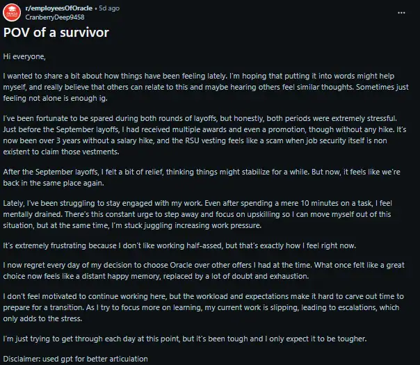 A Reddit post titled “POV of a survivor” has gone viral on forums like r/employeesOfOracle. The author, who kept their job while thousands lost theirs, described a reality that many are silently enduring right now.