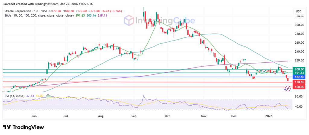 Oracle stock is trading below its 10, 20, 50 and 100-day SMA and has recently broken its 200-day SMA ($218.11), which usually means a change from a correction to a long-term bearish trend. Immediate support is now in the $160–$170 range.