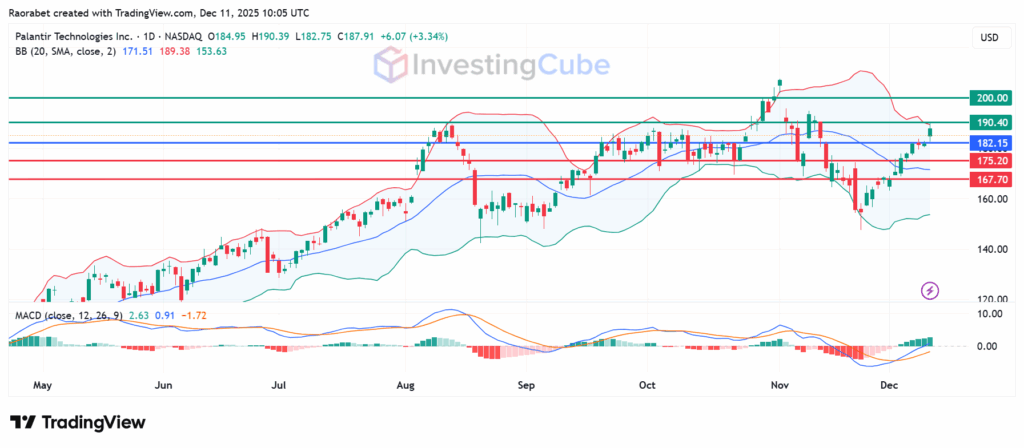 PLTR’s RSI is at 61 and leaning bullish after the contract news, suggesting ongoing buying. The MACD histogram is positive, with the line crossing the signal for upward movement, hinting at faster growth if trading volume holds up. Key support levels are at $175.20 and $167.70. Immediate resistance is around $190.40, just outside the upper Bollinger Band. If the stock flips that into a support, it could build traction to test the $200 mark.