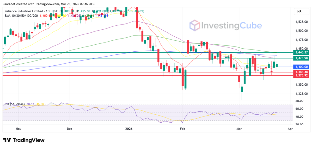 Reliance stock RSI is at 50, indicating a cautiously positive trend. The stock is pivoting at ₹1,400, and action above this psychological round figure level will favour the buyers to stay in control. It has short-term support around ₹1,385. A drop below this level might lead to a test of ₹1,375. On the upside, initial resistance is at the 50-day EMA at ₹1,400, with the potential for the stock to challenge ₹1,440 if it breaks through.