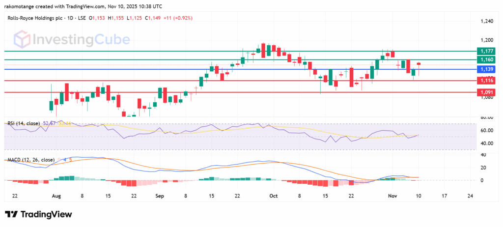 Looking at the stock charts, things seem positive. The RSI is at 52.67, which signals a momentum strong enough to keep things going up. Moreover, the MACD is rising, adding credence to the bullish outlook. Rolls Royce share price will likely meet initial resistance at 1,160p. A break past that could push the action higher to test 1,177p. On the downside, action below 1,139p pivot will favor the sellers to be in control and likely find initial support at 1,116p. A break below that point could send the stock lower to test 1,091p.