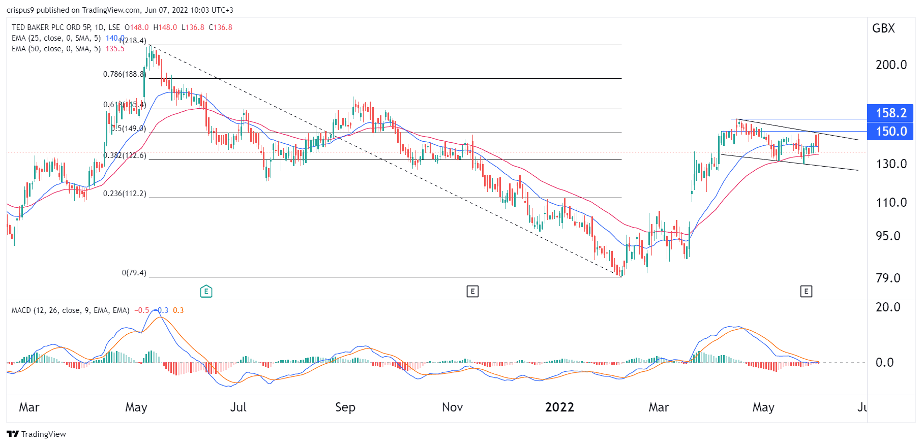 The daily chart shows that the Ted Baker share price has been moving sideways in the past few days as investors watch the bidding war. The shares are trading below the 50% Fibonacci Retracement level. The stock has formed a descending channel shown in black. This channel has a close resemblance to a bullish flag pattern.