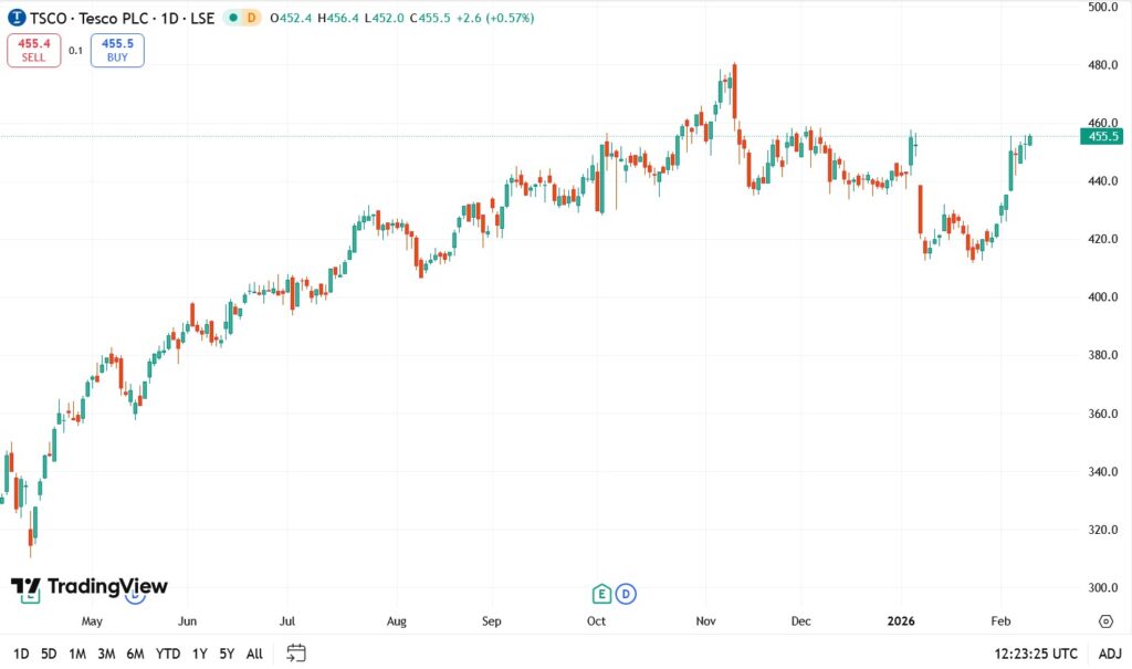 Tesco (LSE:TSCO) staged a significant technical move on Monday, February 9, passing above its 200-day moving average of GBX 438.15. The stock traded as high as GBX 453.60 on strong volume of over 9.3 million shares, marking a clear shift in momentum after the “January hangover” that followed its Christmas trading update.