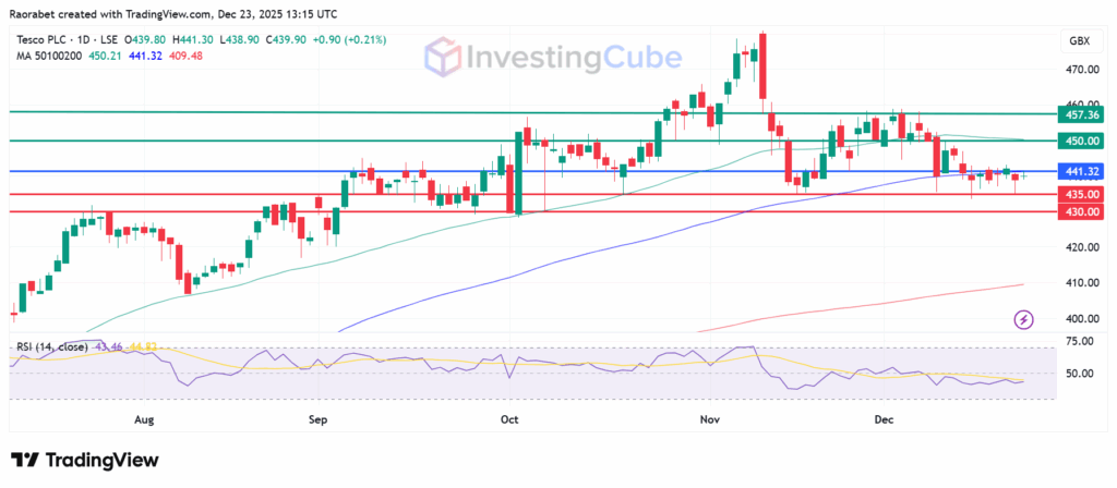 Even so, Tesco (LSE: TSCO) is still the biggest player in the market, with a 28.3% share. Some think this drop is a chance to buy low, since holiday spending is expected to jump by 12%. The stock closed at 439.00p on December 22, due to a few things happening at once. The Guardian mentioned that stores are fighting over prices before Christmas, because people don’t have much money to spend. Because of this, Tesco warned that discounts could lower their profits.