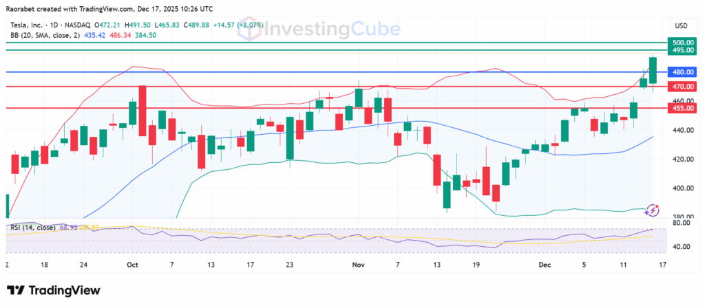TSLA’s RSI nears 70 on daily charts, signaling it’s nearly overbought, and sustaining in bull phases but flashing exhaustion risks. The next barrier is at $495, beyond which the psychological $500 mark will offer technical resistance. If it goes higher, $530 is the next key target. If the price drops, $480, the first support will likely be at $470, below which the upside narrative will be invalid and the resulting momentum potentially open the path to test $455.