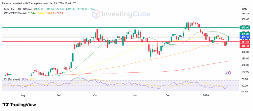 Tesla stock (NASDAQ: TSLA) has had a rough time since late December 2025. Shares fell from around $488 to a low of $419 by January 20, 2026. However, recently, the stock jumped over 7% in two days, hitting $449 by January 22 before dropping slightly to $448 on January 23. This prompts the need to assess the underlying causes and whether the momentum can endure.