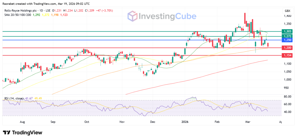 Rolls-Royce stock on the daily chart with key levels of resistance and support on March 19, 2026. Created on TradingView