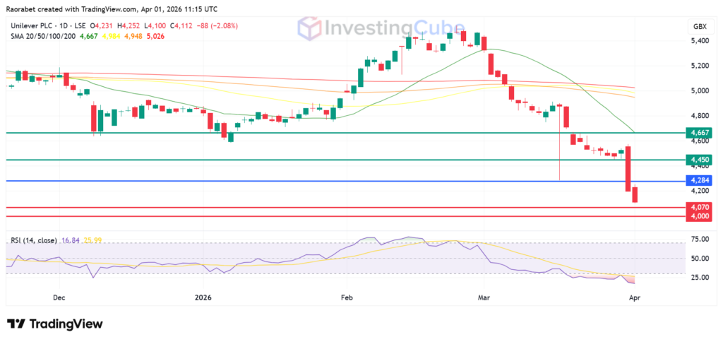 On March 31, Reuters reported a company memo from Unilever’s personal care president, Fabian Garcia, announcing an immediate global hiring freeze for at least three months. The memo cited macroeconomic and geopolitical realities, especially the Middle East conflict, as substantial challenges ahead. While hiring freezes are a conservative measure, in this scenario they highlight caution amid the stock’s recent decline.