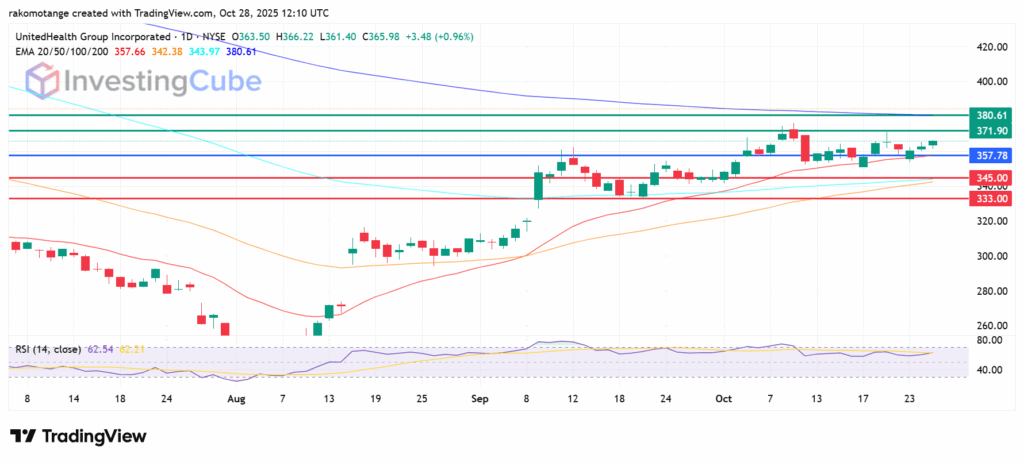 UnitedHealth stock price is above its 20-day EMA at $357.66 and its pivot at $357.78, which shows that the stock is likely to keep going higher. Primary support is at 345.00, and a break below that level could clear the way to test $333, which has been a stable support for the last month.