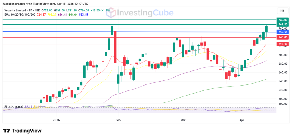 Fresh off the back of strong momentum since March’s final stretch, Vedanta shares have surged more than 26% YTD. As of this writing, in the second week of April, trading sits close to ₹760, a substantial distance from where it stood just weeks ago. Although quiet at first, the climb turned sharp, pulling investors’ eyes as volume picked up without warning.