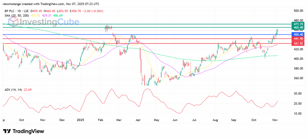 There’s support around 431.92p–441.92p, and resistance around 465.40p–472.25p. If it breaks above the second barrier, it might go on to a YTD high of 480p. The Average Directional Index (ADX) at 22.69 shows that there’s a strong trend, meaning the uptrend has a lot of power behind it.