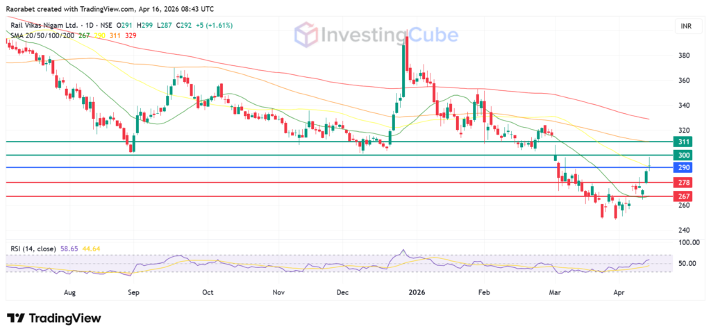 RVNL share price pivots at ₹290 and the RSI at 58 signals a likely continuation of the upward movement if action stays above that level. The stock faces a psychological hurdle at ₹300. A sustained close above this level could trigger a rally to ₹311, aligning with the 100-day SMA level. Strong immediate support is established at ₹278. A secondary support sits at ₹267, which corresponds to the 20-day SMA.
