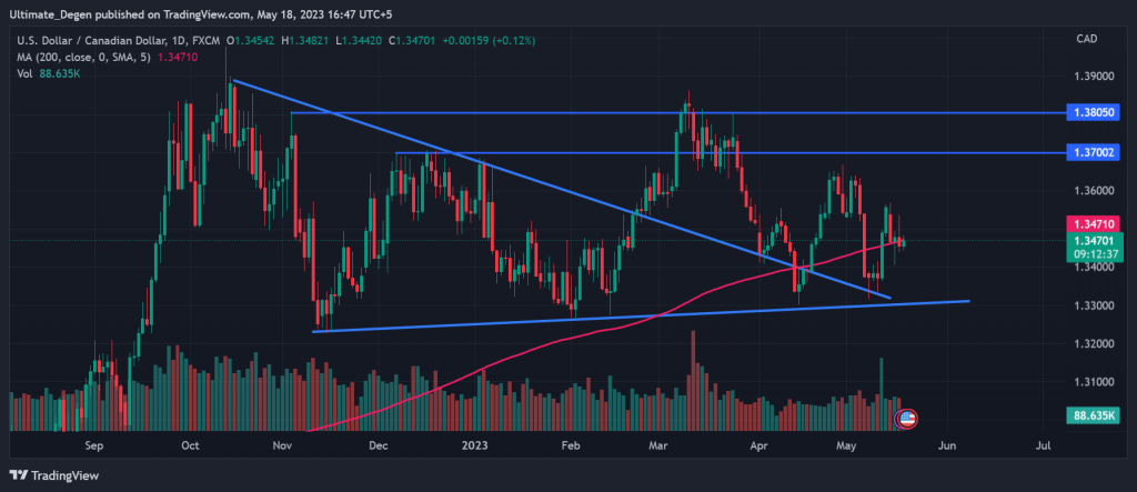 If the price gains acceptance below 200 MA, then USD/CAD forecast will become bearish for at least the short term. This will put a retest of November 2022 low on the cards, which lies at 1.322. However, a strong upward push from here can send the pair to 1.37 very soon if the 200 MA holds on the daily chart.